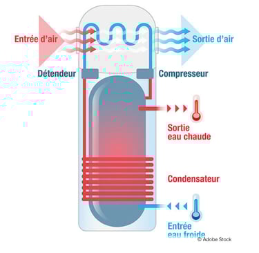 Le ballon thermodynamique utilise une pompe à chaleur pour chauffer l'eau sanitaire, offrant plusieurs avantages intéressants :